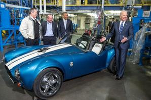 奧巴馬和拜登饒有興致地查看3D打印的碳素纖維Shelby Cobra,用于彩色圖片應用。奧巴馬在白宮的官方博客上說:"我們之所以到這里來是因為,凡是美國人做出重大舉措以壯大美國中產階級和發展本國經濟并向所有人提供機會的地方,我都希望親自前來助一臂之力,找出我們如何才能更好地推廣開來的辦法。"
