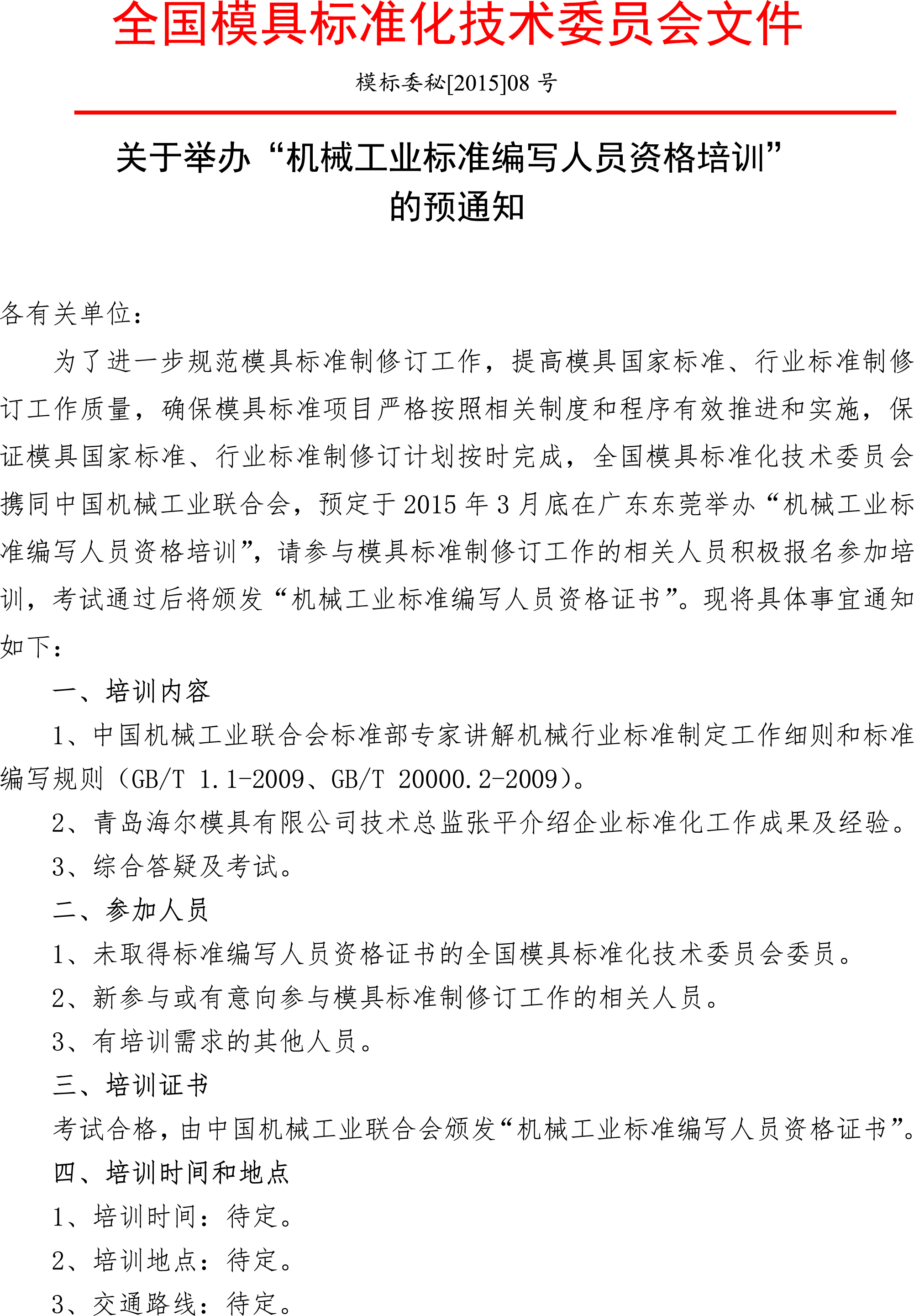 關于舉辦“機械工業標準編寫人員資格培訓”的預通知