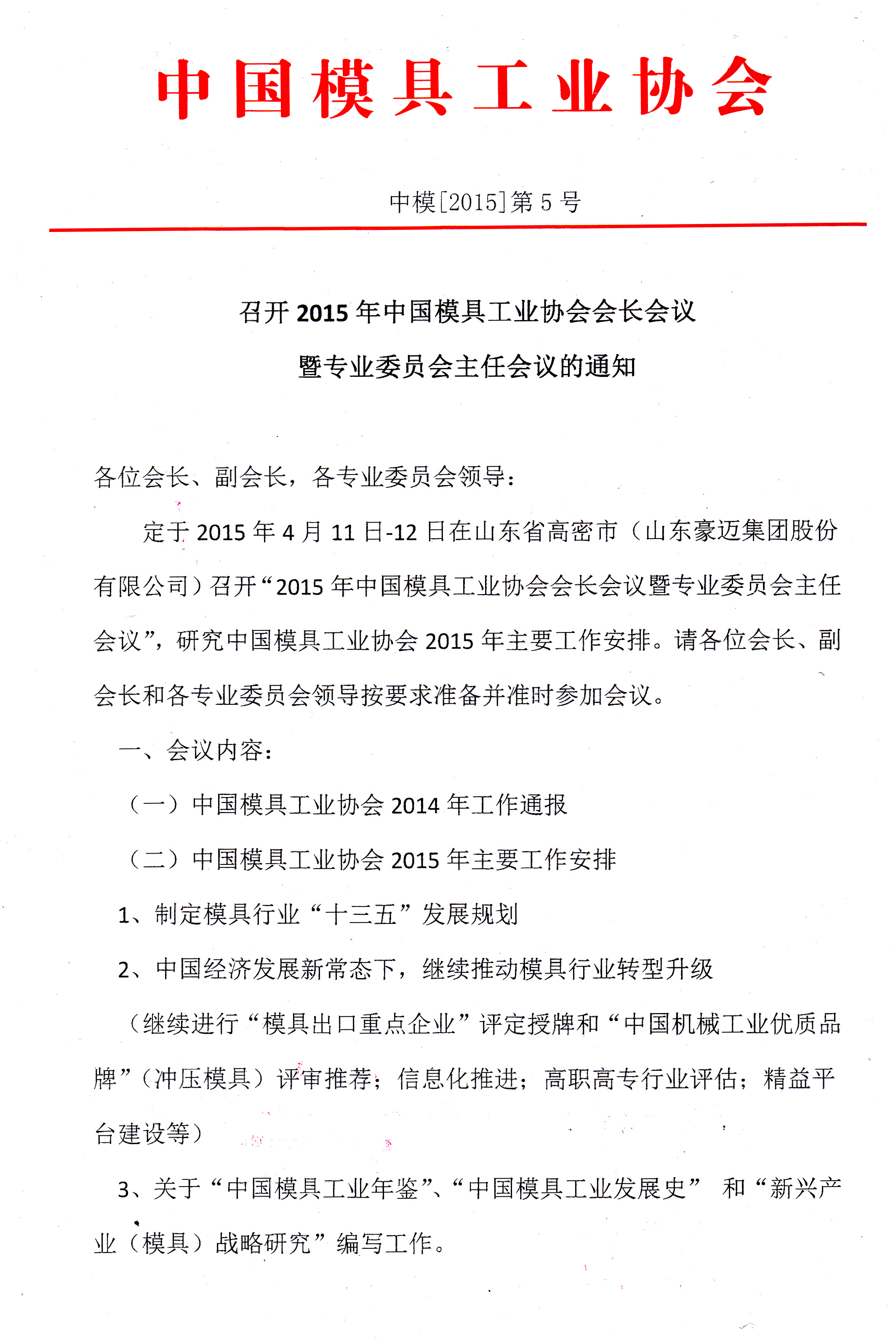 召開2015年中國模具工業(yè)協(xié)會會長會議暨專業(yè)委員會主任會議的通知