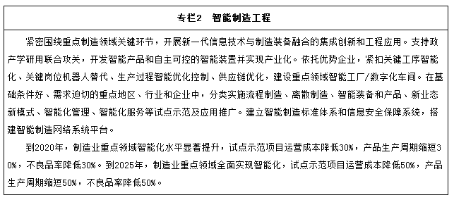 到2025年,制造業整體素質大幅提升,創新能力顯著增強,全員勞動生產率明顯提高,兩化(工業化和信息化)融合邁上新臺階。重點行業單位工業增加值能耗、物耗及污染物排放達到世界先進水平。形成一批具有較強國際競爭力的跨國公司和產業集群,在全球產業分工和價值鏈中的地位明顯提升。
