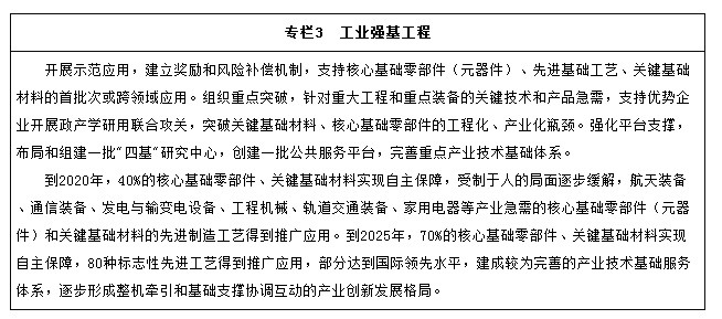核心基礎零部件(元器件)、先進基礎工藝、關鍵基礎材料和產業技術基礎(以下統稱“四基”)等工業基礎能力薄弱,是制約我國制造業創新發展和質量提升的癥結所在。要堅持問題導向、產需結合、協同創新、重點突破的原則,著力破解制約重點產業發展的瓶頸。