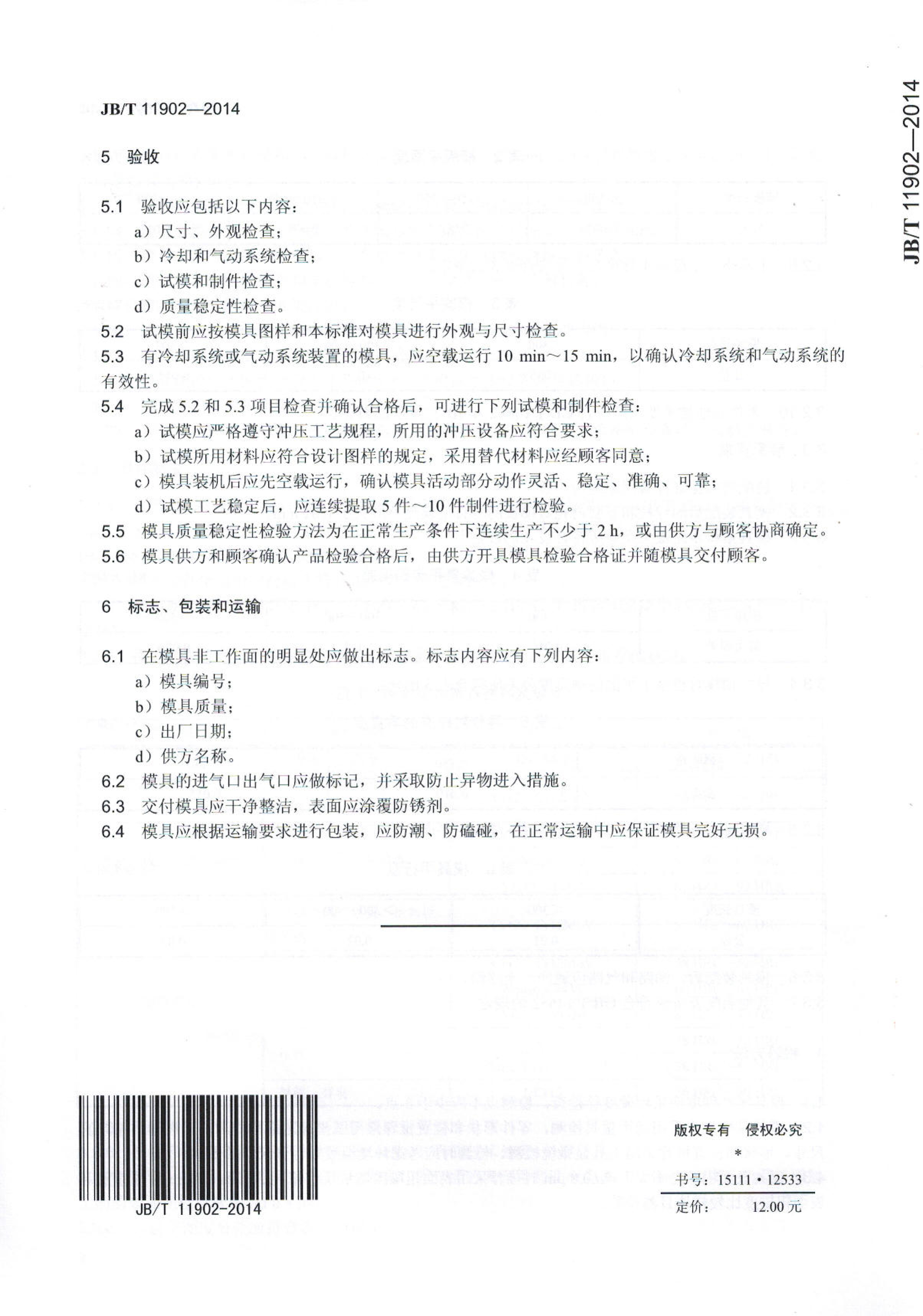 國家標準和行業標準包涵以十大類模具為模具標準主體對象,含概了術語、技術條件、模架、模具零件、結構形式、實驗方法、技術驗收條件、安全等其它條件等等以及模具質量相關基礎標準。“十二五”期間符合模具技術與市場的發展,具有創新性的產業模具標準也在行業標準中占有重要地位。