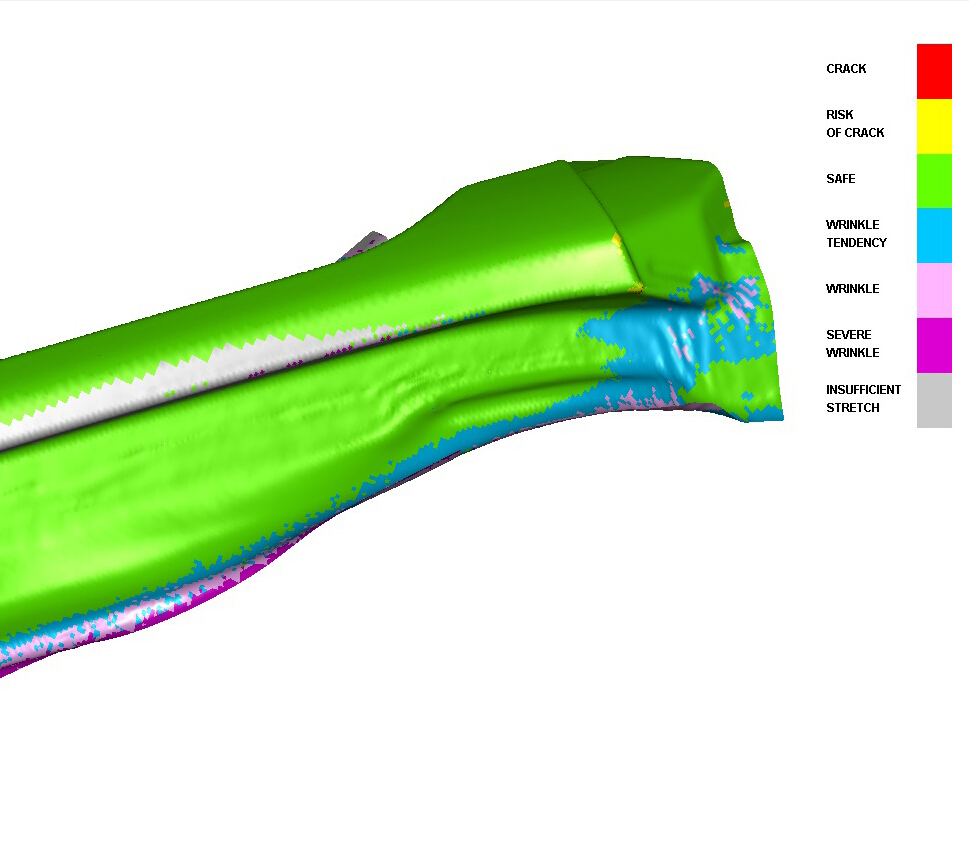 側(cè)圍外板的A柱上部都是優(yōu)先考慮先切邊再側(cè)翻邊的工藝,在此工藝無(wú)法解決疊料的問(wèn)題時(shí)才考慮使用先側(cè)翻邊再切邊的工藝。該側(cè)圍外板正是采用后一種工藝,即側(cè)圍外板在使用先切邊再側(cè)翻邊工藝造形疊料的情況下,改為先側(cè)翻邊再切邊的工藝,經(jīng)過(guò)多次的CAE分析驗(yàn)證最終得出了一種較好的方案(如圖8所示)。在拉延過(guò)程中盡量的少聚積材料,側(cè)翻邊時(shí)把多余的材料分散在一個(gè)較大的區(qū)域,達(dá)到消除疊料的效果,CAE分析結(jié)果如圖9。
