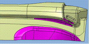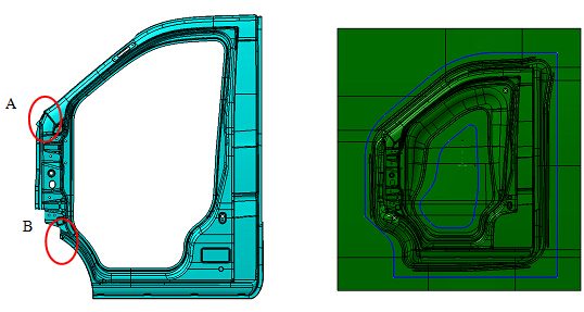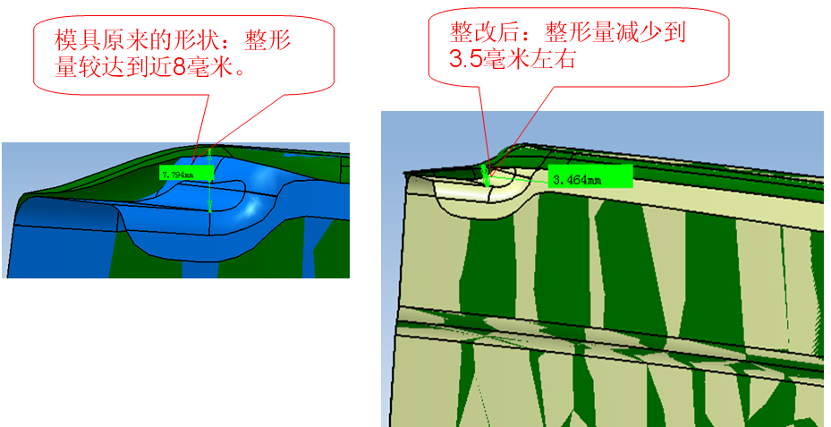 原工藝采用拉延出一部分形狀后序整形的方法,整形量較大達(dá)到近8mm。在保證B處在拉延不開裂的情況下,此臺(tái)階盡量拉延到位,使整形量相對(duì)減少到3.5mm左右,整形時(shí)疊料缺陷消除。整改前后數(shù)模對(duì)比如下圖: