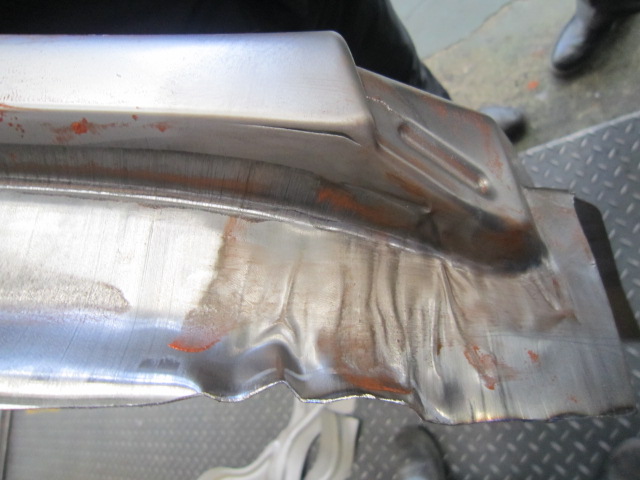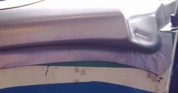該側(cè)圍外板模具經(jīng)過(guò)長(zhǎng)時(shí)間的調(diào)試,最突出的難點(diǎn)最終表現(xiàn)在零件A柱上部(圖1A處)側(cè)翻邊時(shí)容易開裂,并在前端形成疊料,嚴(yán)重影響模具的開發(fā)進(jìn)程,進(jìn)而影響裝車。產(chǎn)品形狀和翻邊開裂疊料情況如圖5和圖6所示。