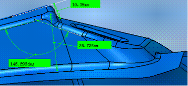 如圖7所示,該側(cè)圍外板產(chǎn)品A柱上部側(cè)翻邊高度大(一般的側(cè)圍高度為25mm,該側(cè)圍高35mm),與翼子板搭接面臺(tái)階高10mm(一般的側(cè)圍高度為5~8mm),翻邊線夾角很小的“三角形”,夾角只有146.7度左右(夾角越接近180度越不會(huì)形成疊料),導(dǎo)致側(cè)翻邊時(shí)在最高的尖角處撕裂。另外,此形狀決定了拉延時(shí)在“三角形”區(qū)域聚集了過(guò)多的材料,而此處側(cè)翻邊時(shí)的法蘭面為平面,把三角形狀的材料在側(cè)圍邊上整形為平面,如果排不出多余的材料必然形成疊料。