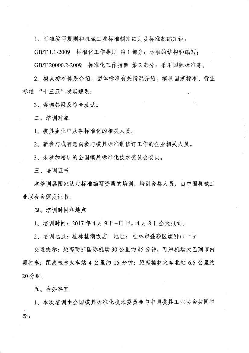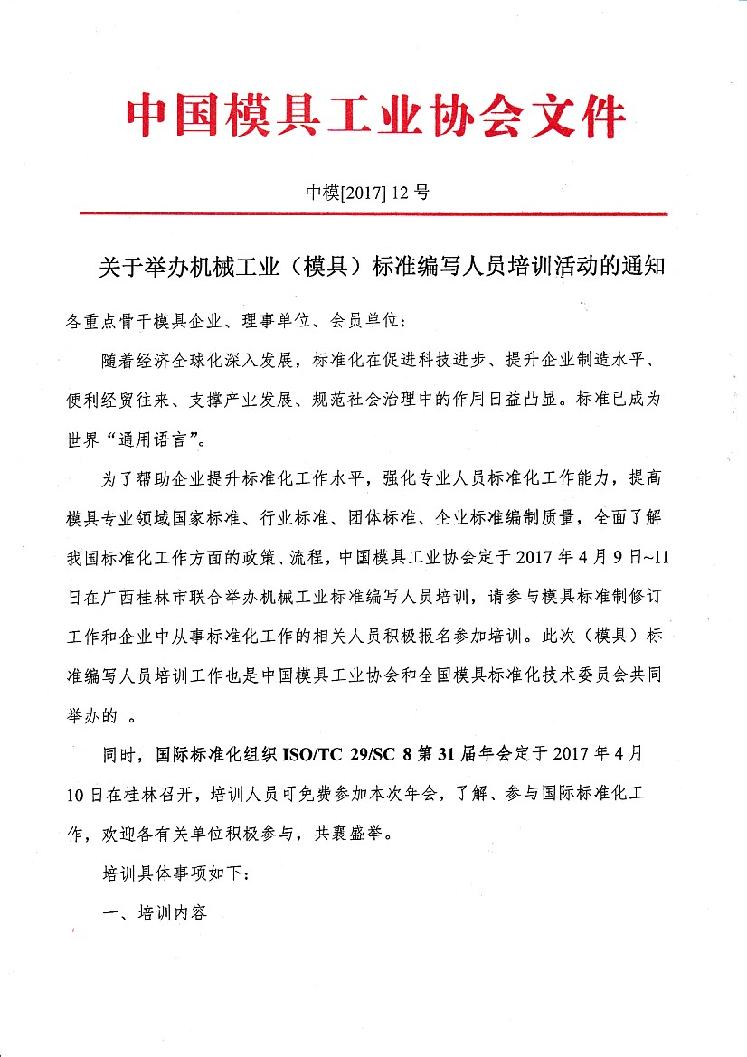 關于舉辦機械工業(模具)標準編寫人員培訓活動的通知