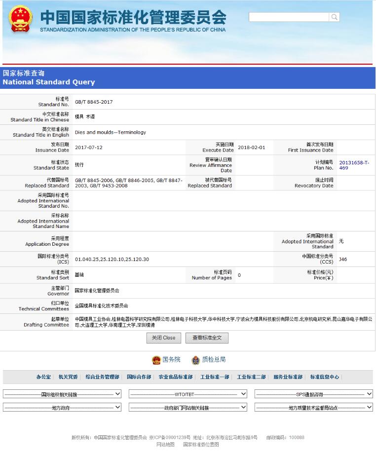 《模具 術語》GB/T 8845-2017將于2018年2月1日正式實施