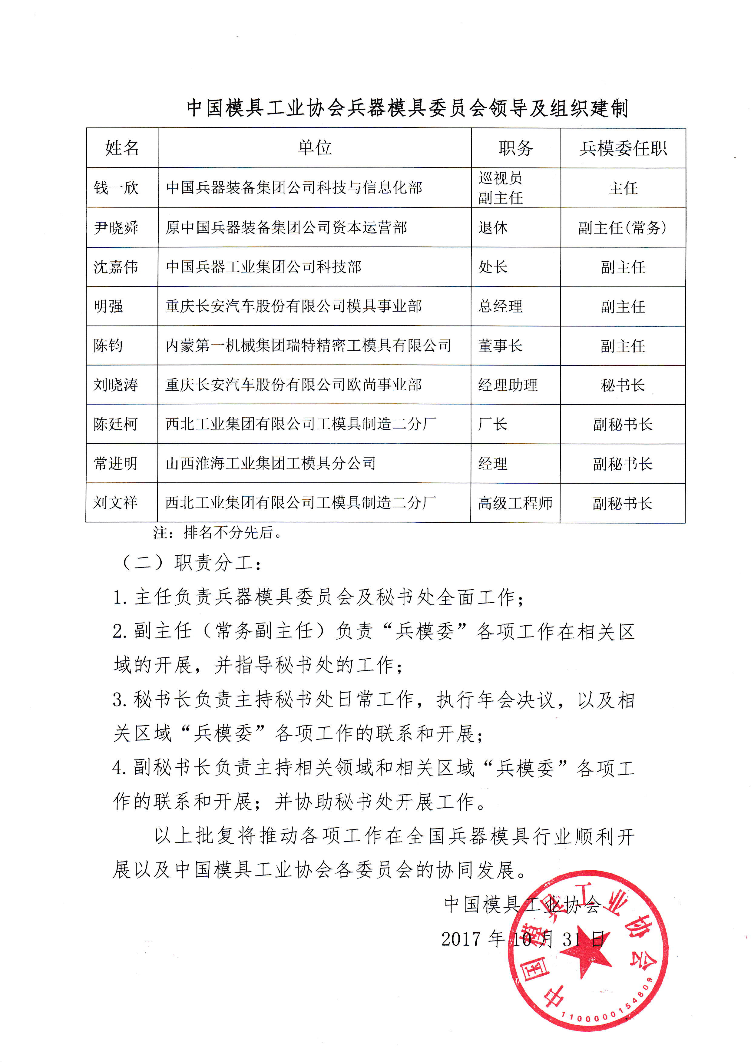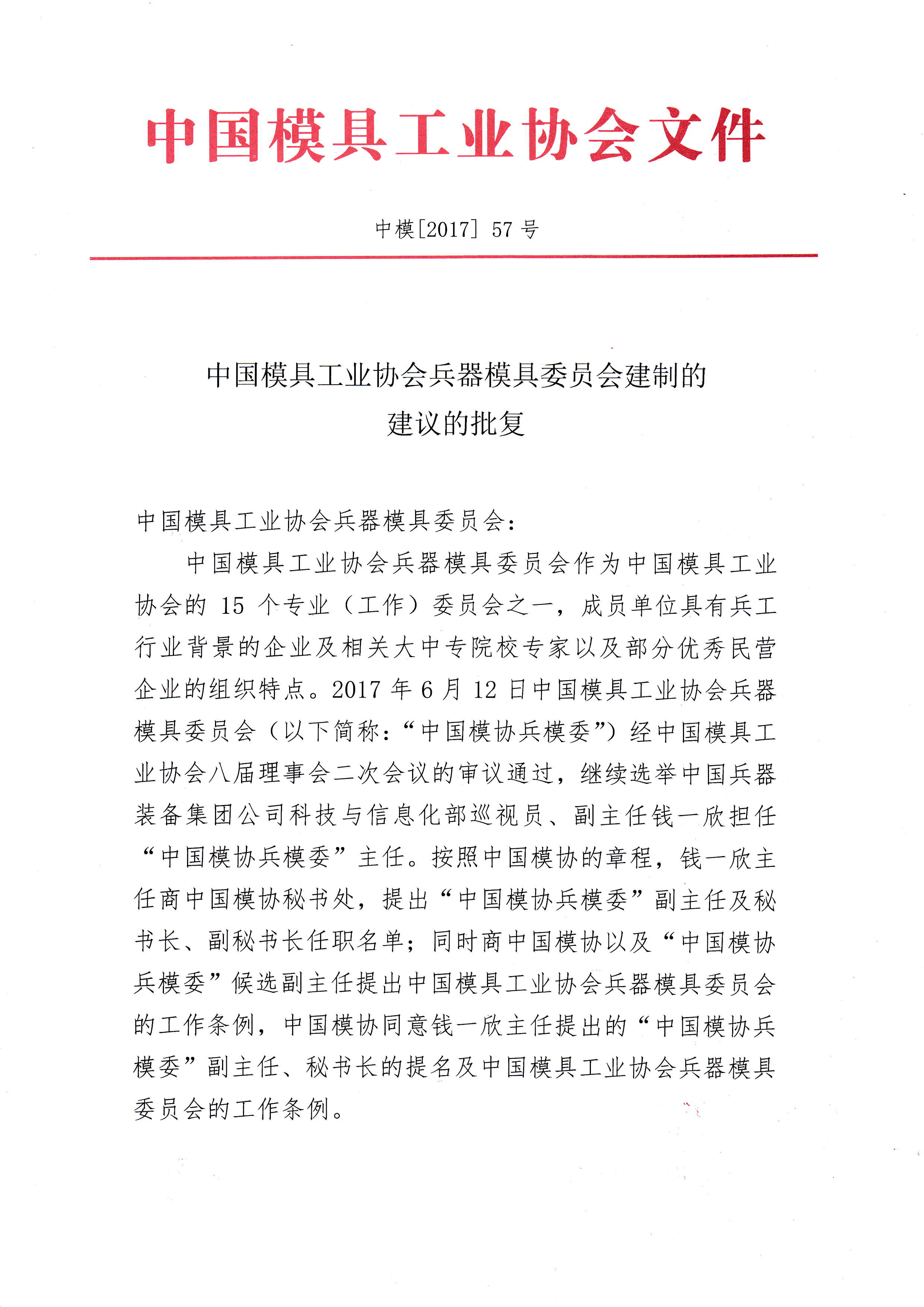 中國模具工業(yè)協(xié)會(huì)兵器模具委員會(huì)建制的建議的批復(fù)