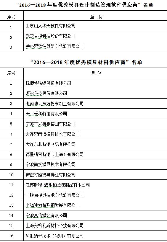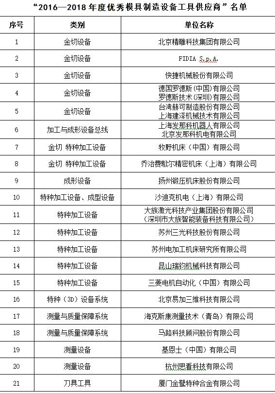 在知名品牌專業展會——中國國際模具技術和設備展覽會DMC上開展優秀供應商的評選活動,得到了各行業的廣泛認可,被評定為優秀供應商的企業,將在模具企業的采購中獲得優先推薦資格并在行業里得到廣泛的宣傳推廣,并在中國模協的官網上進行公告,至今已成定式。DMC2018期間,中國模具工業協會委托中國模協裝備委員會、數字化信息化委員會、材料委員會,本著自愿的原則,依據供應商的技術水平、在模具行業的服務能力、市場占有率的高低、模具行業服務滿意度等行業貢獻指標,并結合模具企業的意見,最終評選出21家“2016—2018年度優秀模具制造設備工具供應商”、3家“2016—2018年度優秀模具設計制造管理軟件供應商”、16家“2016—2018年度優秀模具材料供應商”(同時見www.kfxpdv.com,diemouldchina.com.cn),具體名單如下所示,排名均不分先后。