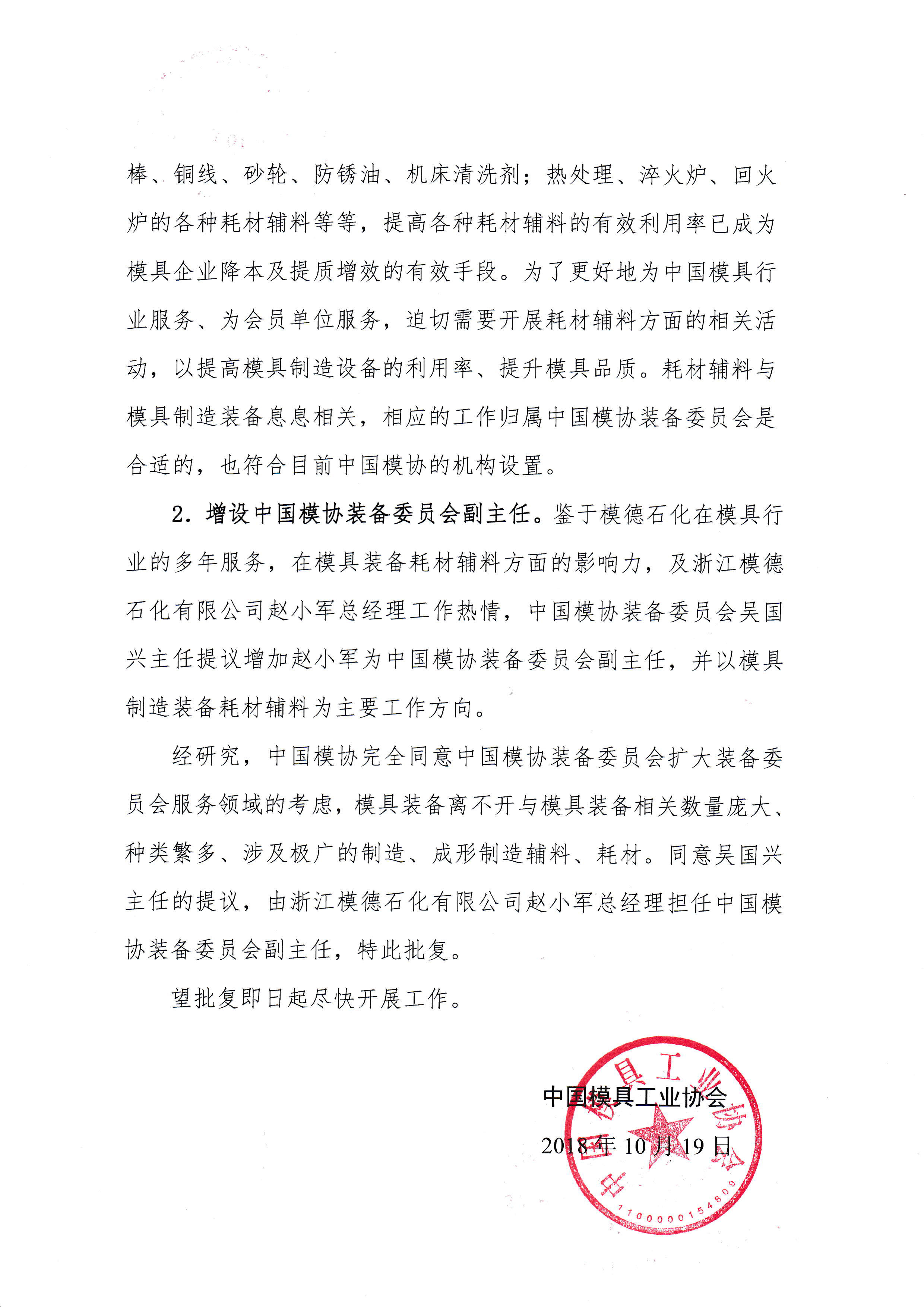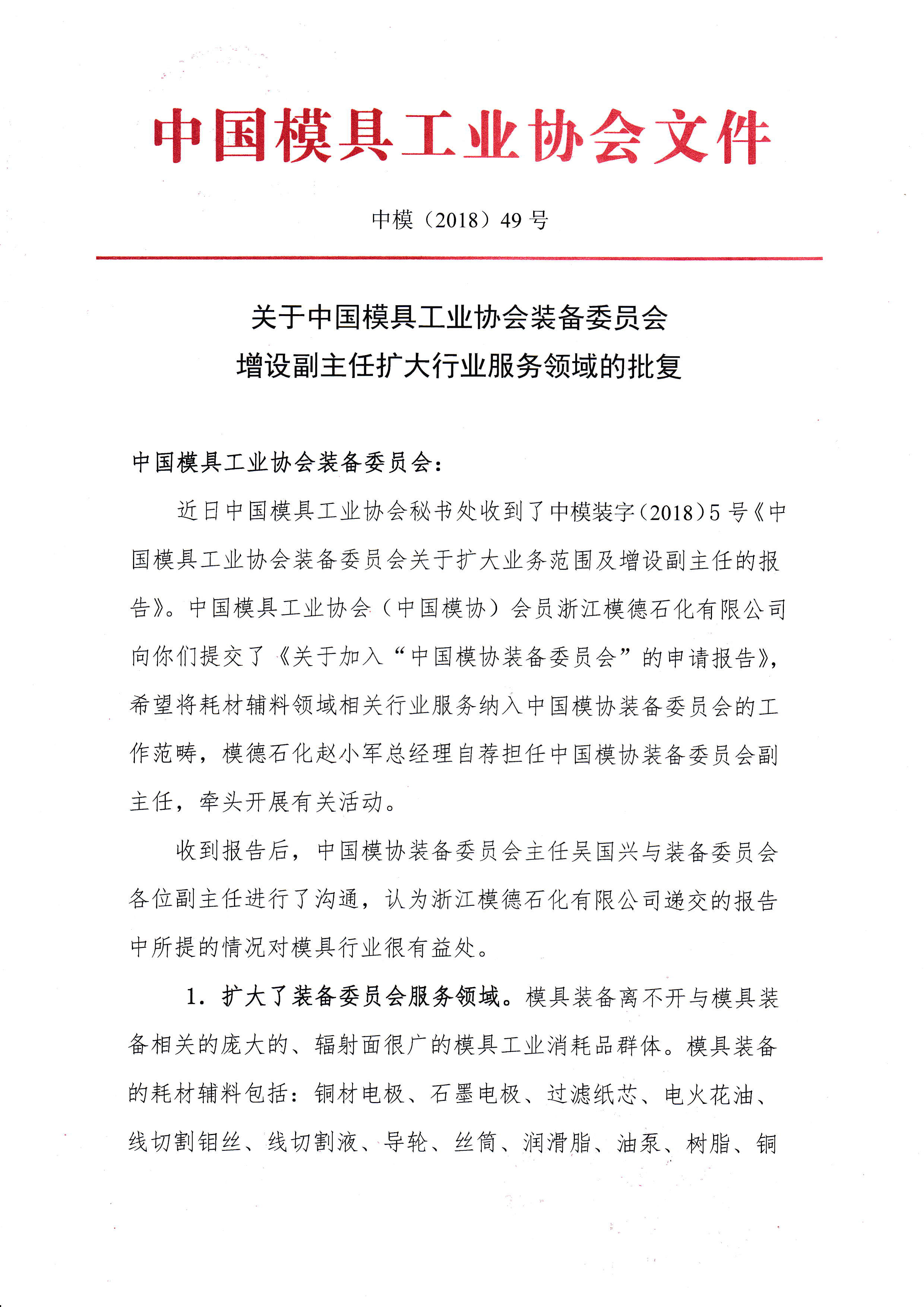關(guān)于中國模具工業(yè)協(xié)會(huì)裝備委員會(huì)增設(shè)副主任擴(kuò)大行業(yè)服務(wù)領(lǐng)域的批復(fù)