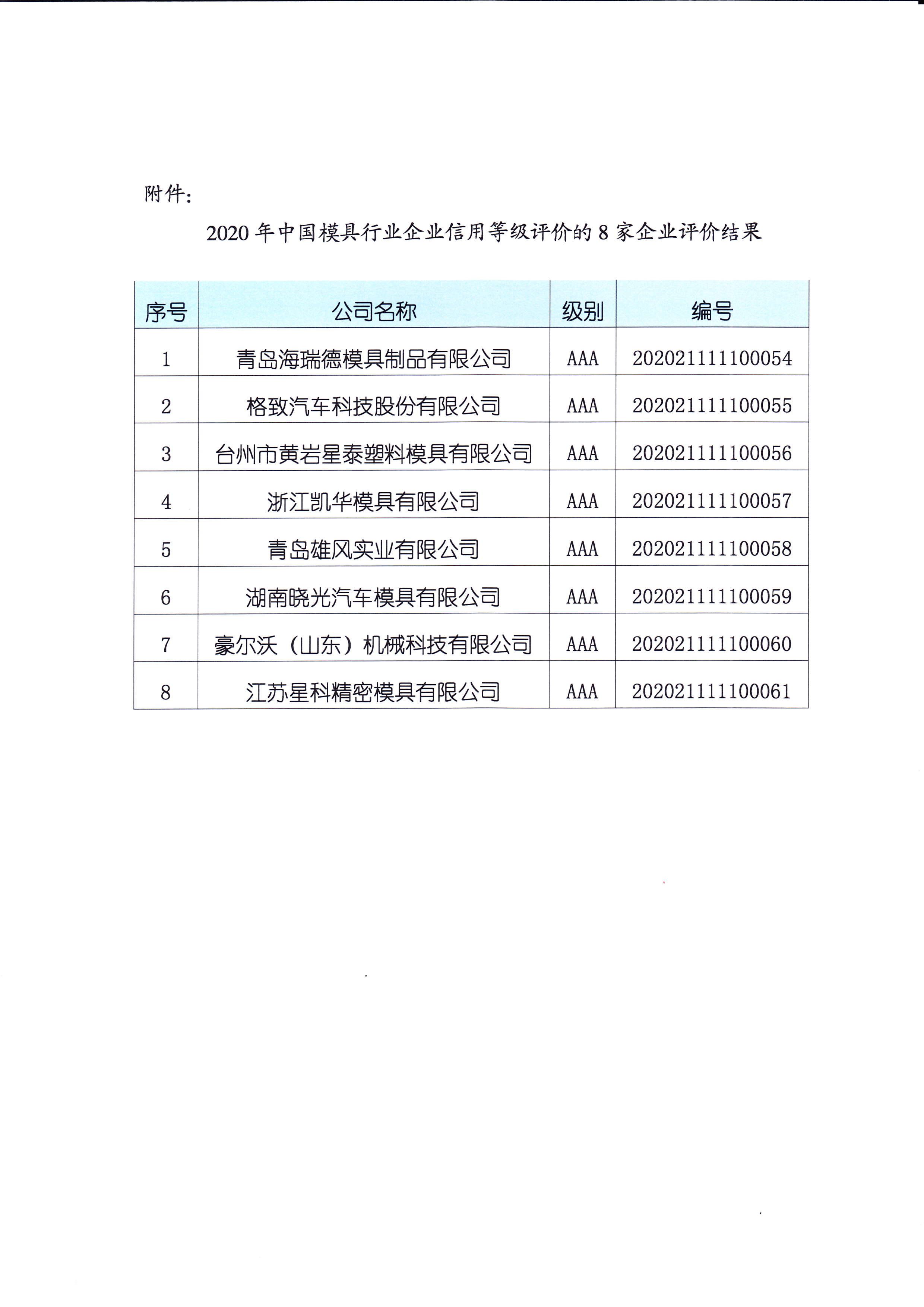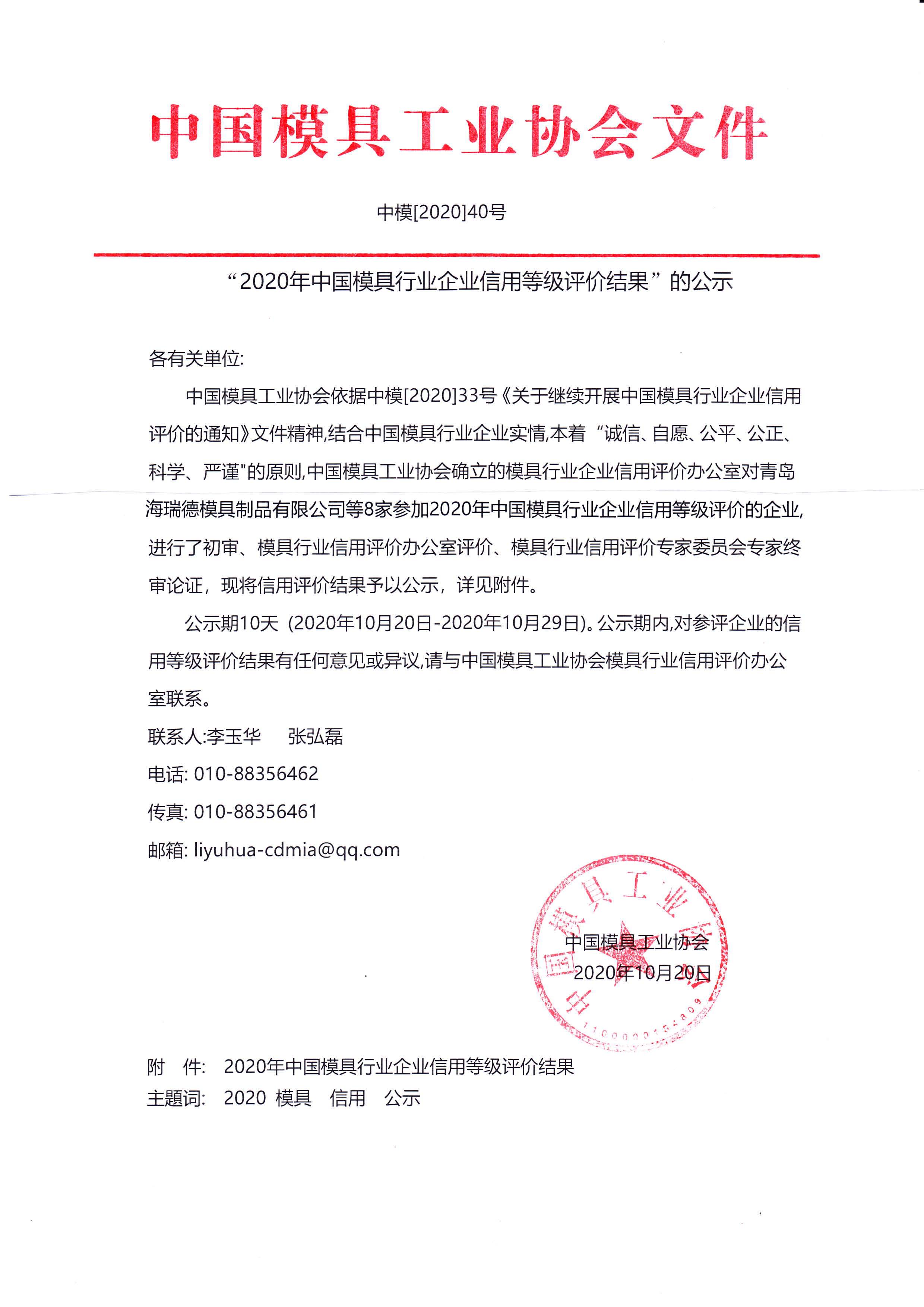 “2020年中國模具行業(yè)企業(yè)信用等級評價結(jié)果”的公示