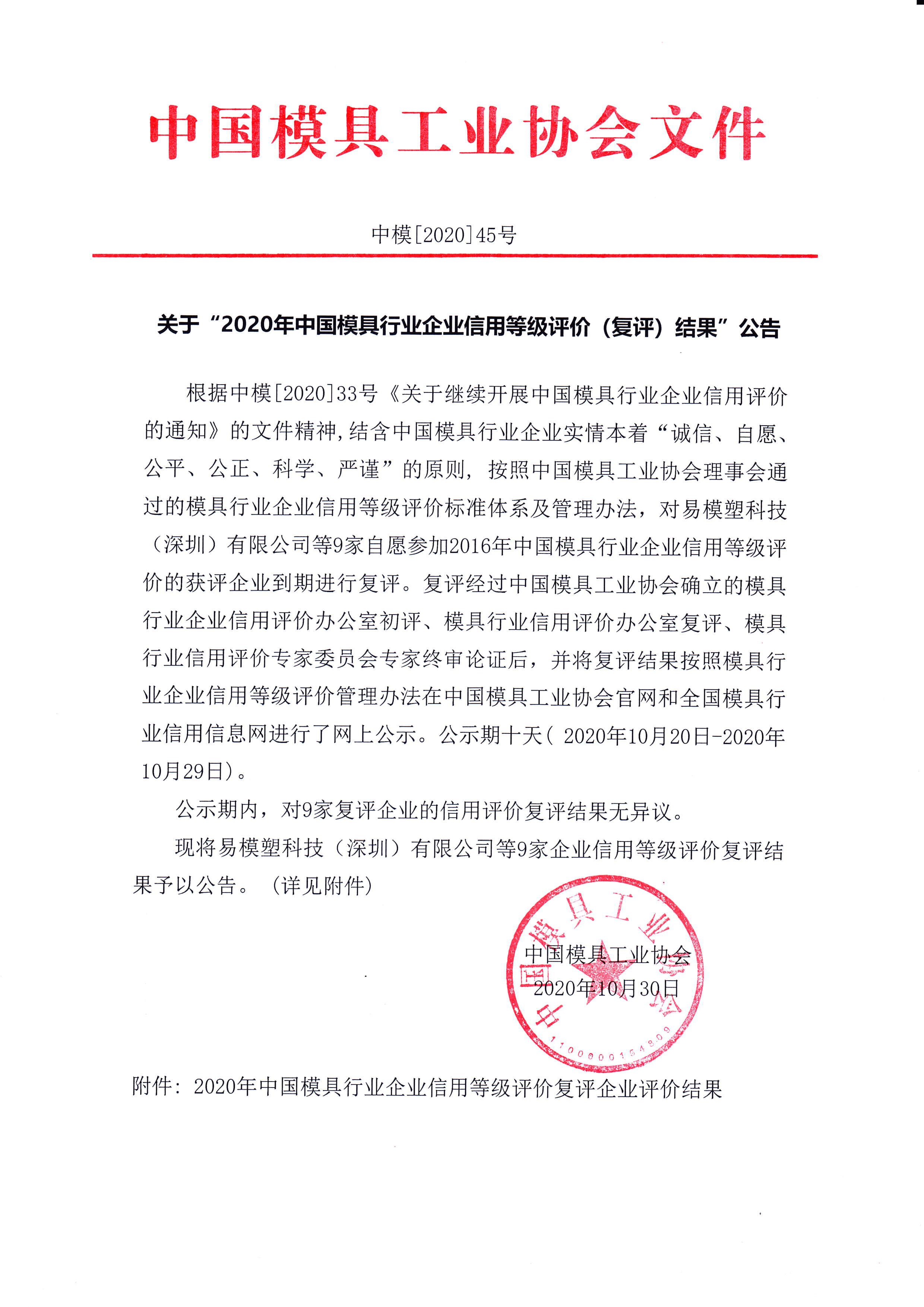 關(guān)于“2020年中國模具行業(yè)企業(yè)信用等級評價(復評)結(jié)果”公告