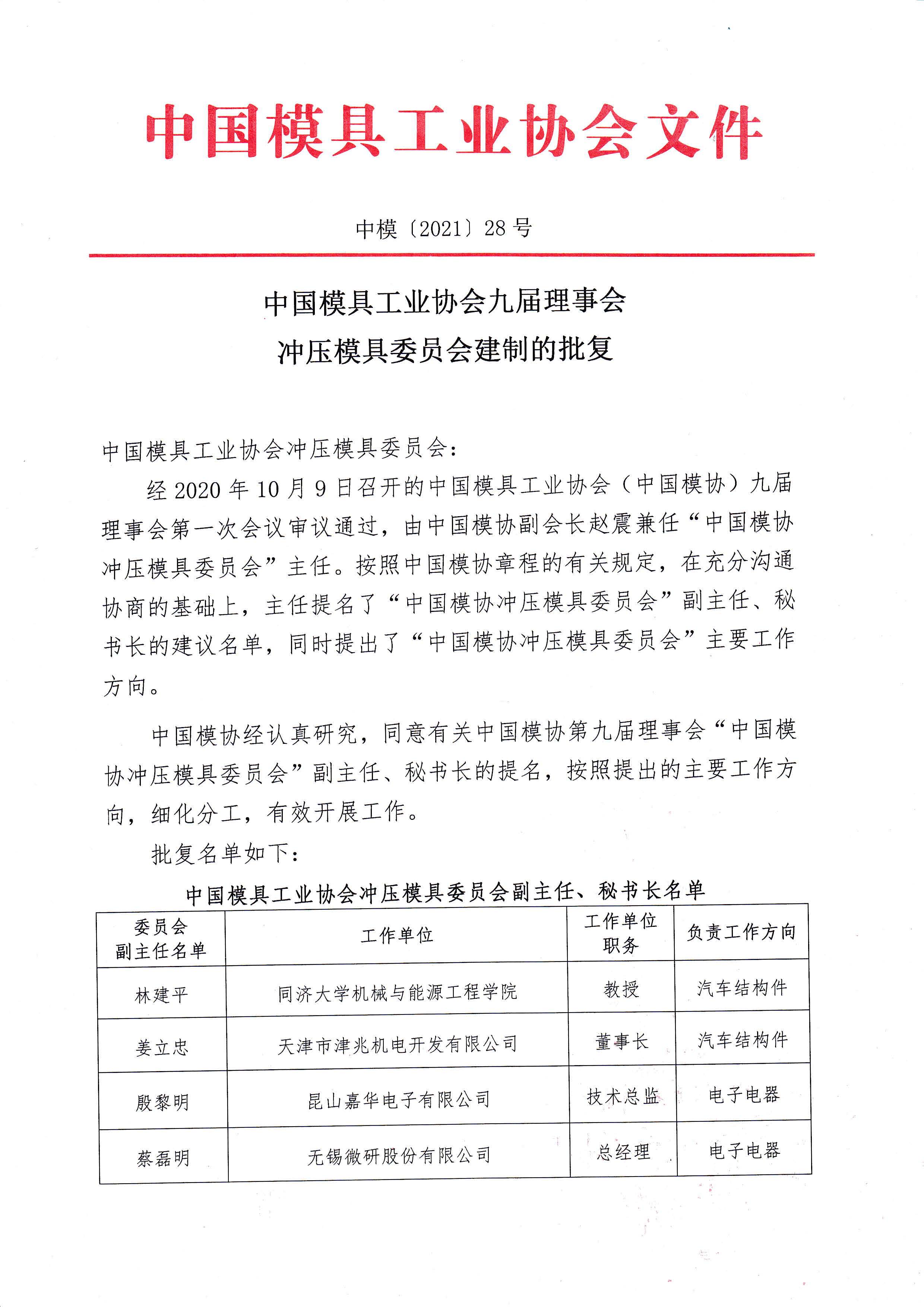 第九屆理事會沖壓模具委員會建制的批復(fù)