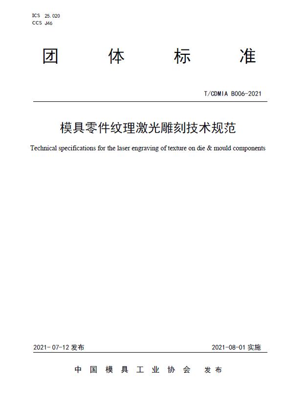 中國(guó)模協(xié)標(biāo)準(zhǔn)T/CDMIA B006-2021模具零件紋理激光雕刻技術(shù)規(guī)范