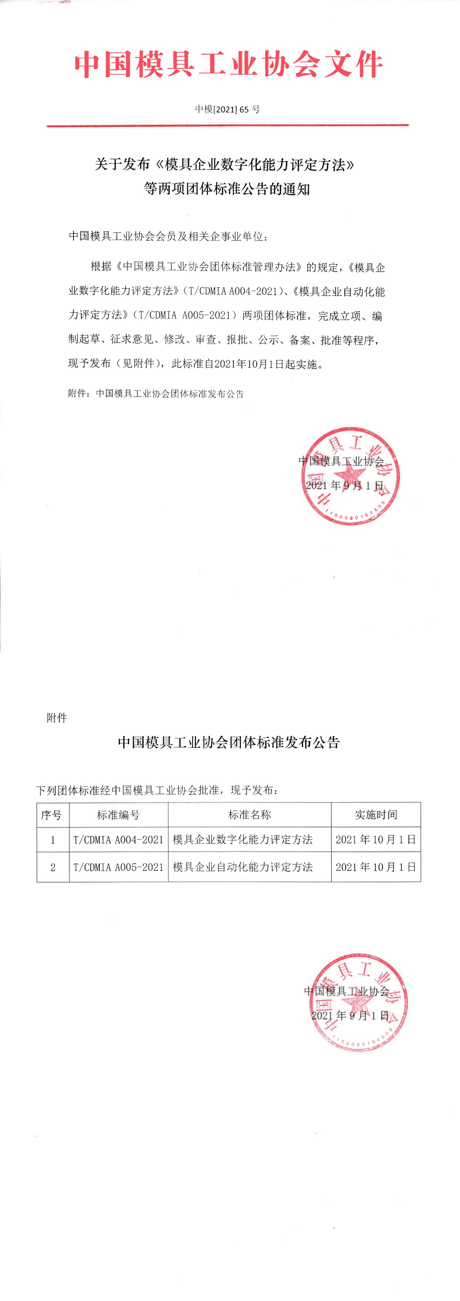 關(guān)于發(fā)布《模具企業(yè)數(shù)字化能力評定方法》等兩項團體標(biāo)準(zhǔn)公告的通知