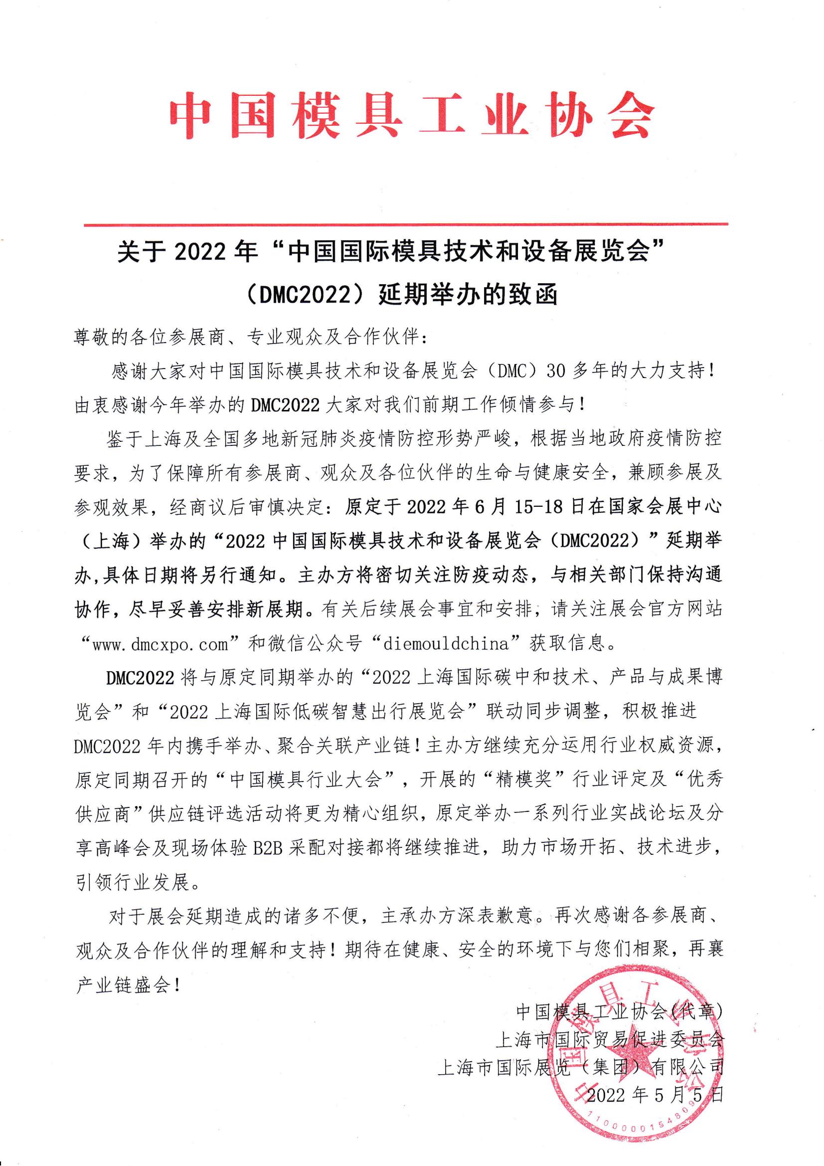 關(guān)于2022年“中國(guó)國(guó)際模具技術(shù)和設(shè)備展覽會(huì)”(DMC2022)延期舉辦的致函