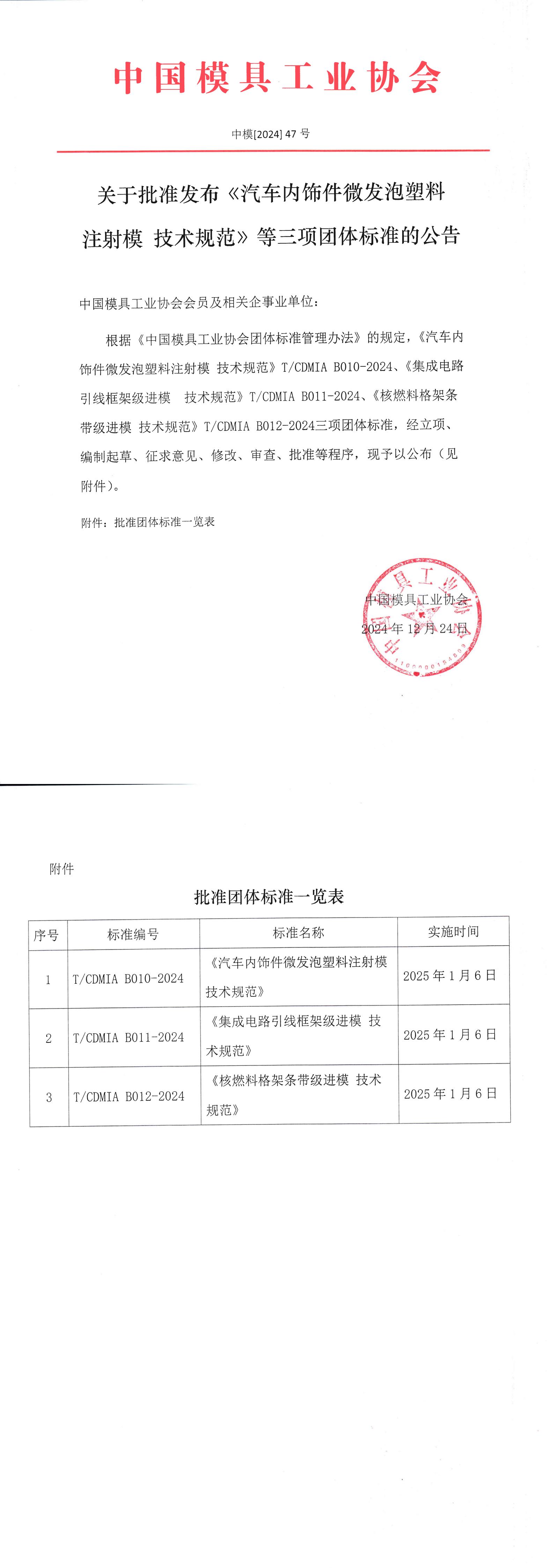 關于批準發布《汽車內飾件微發泡塑料注射模 技術規范》等三項團體標準的公告